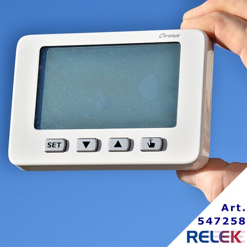 CHRONOS KEY: termostat för väggmontering, med bakgrundsbelyst LCD-skärm och knappar för inmatning och programmering / styrning. Bakgrundsbelysningen på skärmen tänds upp när man trycker på en av knapparna.