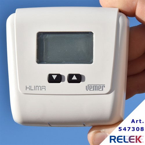 Rumstermostat för utanpåliggande montering, med LCD-visning och 2 knappar för styrning. Denna termostat har lösenordsfunktion, som hindrar obehöriga personer att ändra temperatur (valfri funktion), vilket ofta är uppskattat i t.ex. offentliga miljöer, skolor etc.
