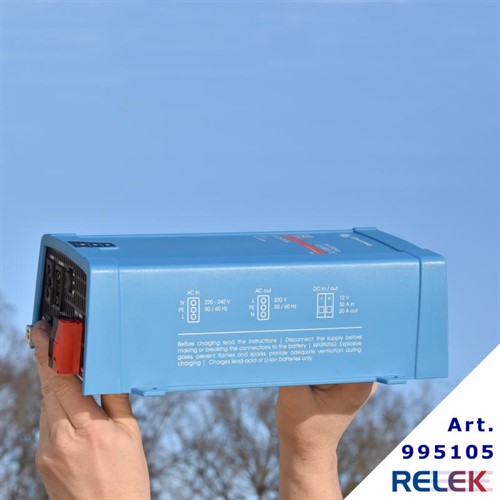 Detta är en komplett nödströmsanläggning, med 500W omformare, elektronisk batteriladdning (20A) och snabb automatik för in- och urkoppling.